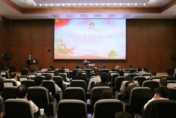 韩冬雪教授从十九大报告关键词出发,结合他个人的学习体会,带领参会人员一起学习了中国共产党人的初心和使命,中国特色社会主义进入新时代,我国社会主要矛盾变化,新时代中国特色社会主义思想等十九大报告的新提法的深刻涵义;学习了十九大报告关于经济、政治、文化、社会、生态、军事、外交、国防等领域的实践新举措;重点学习了报告中关于新时代党的建设总要求,坚持和加强党的全面领导,坚持党要管党、全面从严治党,加强党的长期执政能力建设,防止和反对宗派主义、圈子文化、码头文化,开展“不忘初心、牢记使命”主题教育,赋予有干部管理权限的党组相应纪律处分权限,夺取反腐败斗争压倒性胜利,强化不敢腐的震慑、扎牢不能腐的笼子、增强不想腐的自觉,用留置取代“两规”措施等党建方面的重要新举措。